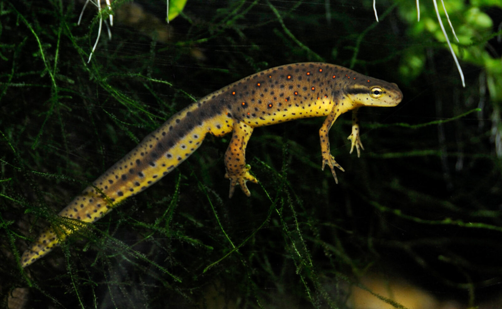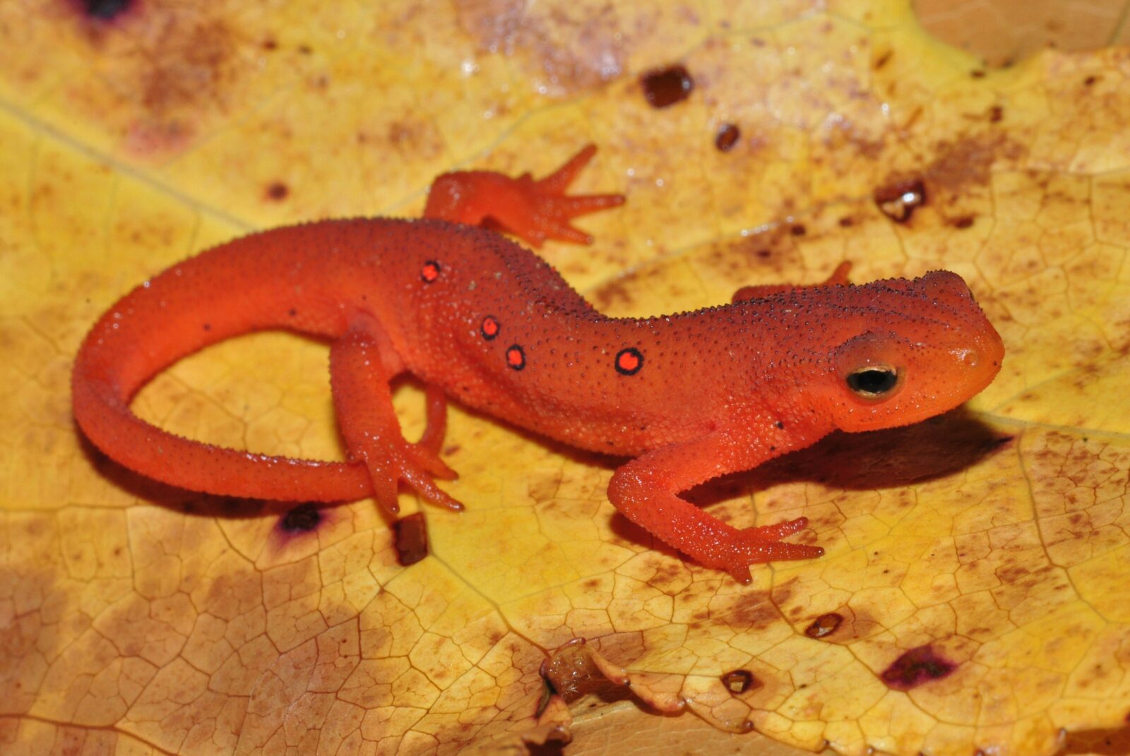 成年人是一種綠色的色調,背面被黑色包圍著許多紅點。腹部是黃色,帶有小黑點。綠色的幼蟲頭兩側都有一條黑條紋。青少年,稱為紅色 efts,呈鮮紅色至橙色,包圍著黑色的紅色斑點。