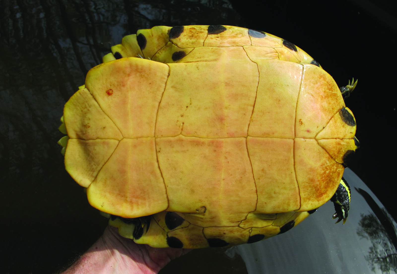 這是一隻大型淡水龜,最大衣長度為 11。4 英寸在美國,外殼(上層殼)為橢圓形,凹凸起,橄欖色到棕色,帶有黃色的痕跡。老人可能是完全黑人的。外殼的後邊緣有鋸齒狀。塑形(下殼)是黃色,帶有黑色的痕跡;通常在後面的塑形上有兩個實體黑點。眼睛後面有一條垂直的黃色線條,頸部,手臂和腿上有條紋。在五月至七月期間,發現卵子和巢穴的雌性。通常有 10 至 12 的雞蛋,儘管較大的雌性可能會產更多。新孵化的幼苗會留在巢穴裡,直到大雨釋放了覆蓋的土壤。交配發生在春季,秋季和冬季。活動期間為 4 月至 10 月。
